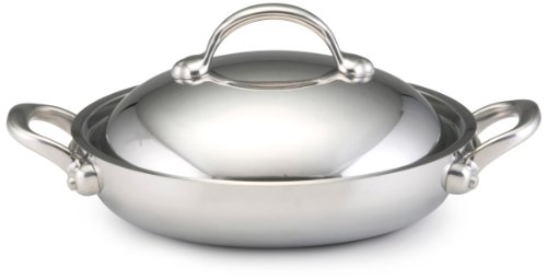 - 10.5 inch copper clad covered braiser pan; works on top of stove or in the oven; straight to table